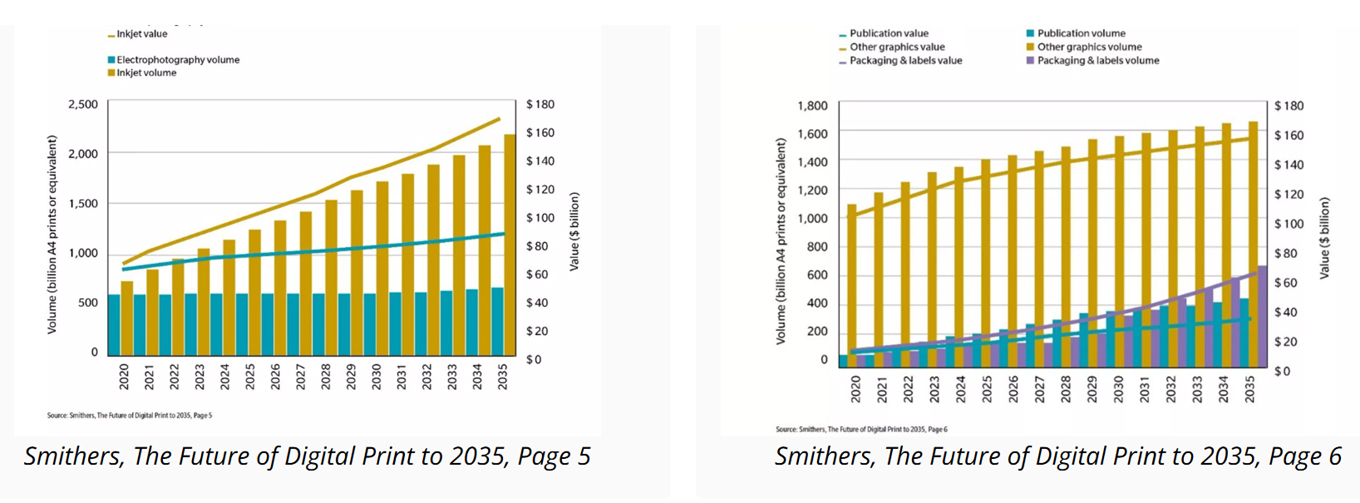 Araştırma uzmanı Smithers’ın çığır açan bir çalışması, değişimin boyutunu doğruluyor. Dijital baskı artık kitaplarda, posta gönderilerinde, ekranlarda, güvenlik ve etiketlerde sağlam bir şekilde yerleşmiş durumda ve ambalajlarda, dergilerde ve ticari baskıda da benimseniyor.